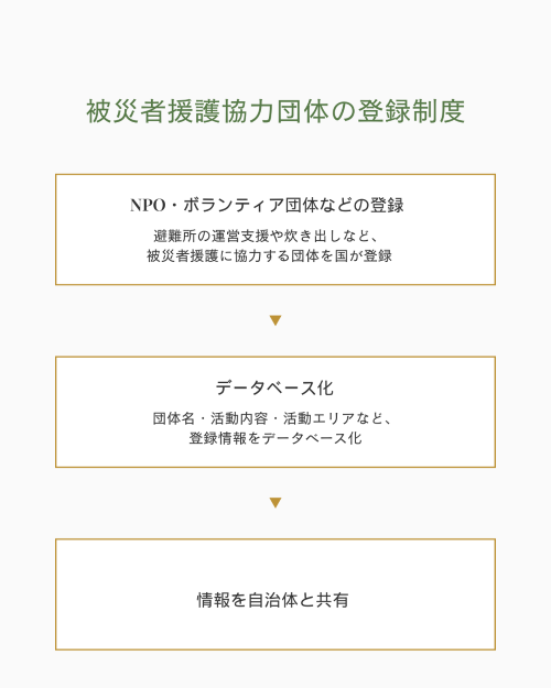 法改正を受けて始まった取り組みの中で、特に画期的なのが、「被災者援護協力団体の登録制度」の創設です。